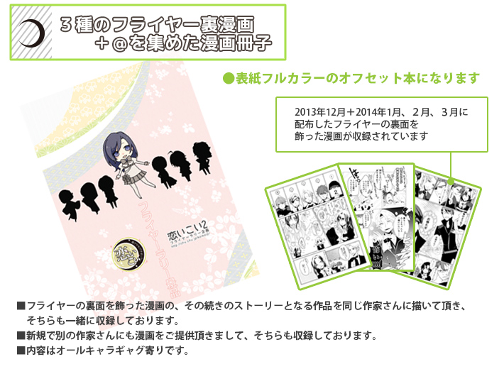 12月の『コミックマーケット85(冬コミ)』・1月『COMIC CITY 大阪97(インテ)』(第1弾)、2月は『ラヴ♥コレクション2014』(第2弾)、3月は『HARU COMIC CITY 19(春コミ)』(第3弾)で、時期によって変わる全三種となります。
